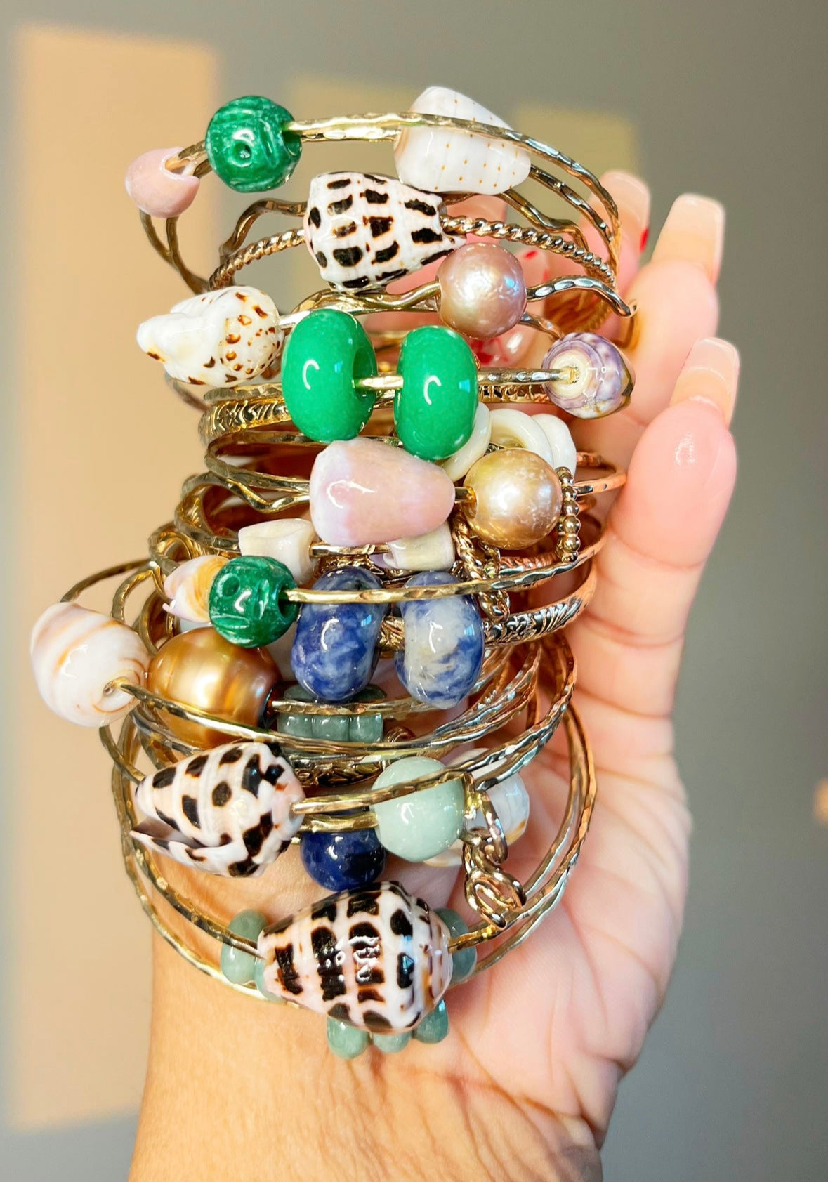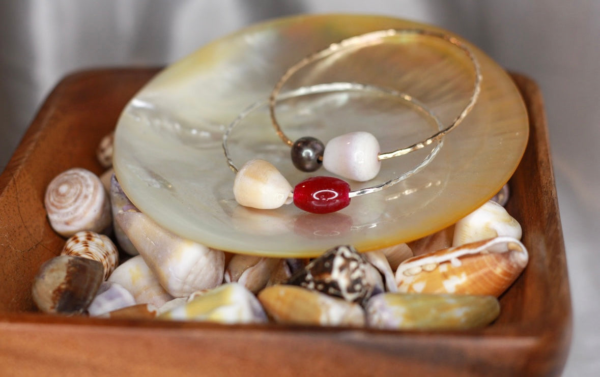Make a stylish statement with this unique pastel cone bangle. It features shells from Hawaiian beaches for a delicate touch and an eye-catching design. Perfect for those summer days!